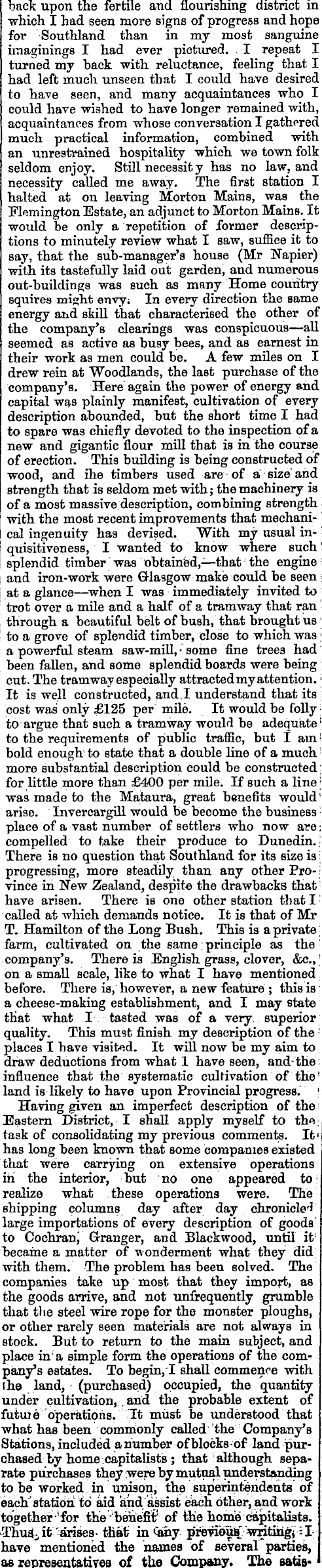 back upon the fertile and flourishing district in which I had seen more signs of progress and hope for Southland than in my most sanguine imaginings I had ever pictured. . I repeat I turned my back with reluctance, feeling that I had left much unseen that I could have desired to have seen, and many acquaintances who I could have wished to have longer remained with, acquaintances from whose conversation I gathered much practical information, combined with an unrestrained hospitality •which we town folk seldom enjoy. Still necessit y has no law, and necessity called me away. The first station I halted at on leaving Morton Mains, was the Flemington Estate, an adjunct to Morton Mains. It would be only a repetition of former descriptions to minutely review what I saw, suffice it to say, that the sub-manager's house (Mr Napier) with its tastefully laid out garden, and numerous out-buildings was such as many Home country squires might envy; In every direction the same energy atd skill that characterised the other of the company's clearings was conspicuous — all seemed as active as busy bees, and as earnest in their work as men could be. A few miles on I drew rein at "Woodlands, the last purchase of the company's. Here again the power of energy and capital was plainly manifest, cultivation of every description abounded, but the short time I had to spare was chiefly devoted to the inspection of a new and gigantic flour mill that is in the course of erection. This building is being constructed of ' wood, and ihe timbers used are of a size' and strength that is seldom met with; the machinery is ! of a most massive description, combining strength with the most recent improvements that mechanical ingenuity has devised. With my usual inquisitiveness, I wanted to know where such' splendid timber was obtained,— that the engine i and iron-work were Glasgow make could be seen ■ at a glance — when I was immediately invited to trot over a mile and a half of a tramway that ran through a beautiful belt of bush, that brought us ; to a grove of splendid timber, close to which was ; a powerful steam saw-mill, • some fine trees had been fallen, and some splendid boards were being cut. The tramway especially attracted my attention. • It is well constructed, and, l understand that its cost was only £125 per mile. It would be folly ; to argue that such a tramway would be adequate l to the requirements of public traffic, but I am! bold enough to state that a double line of a much ; more substantial description could be constructed; for little more than £400 per mile. If such a line ; was made to the Mataura, great benefits would ' arise. Invercargill would be become the business ; place of a vast number of settlers who now are • compelled to take their produce to Dunedin.; There is no question that Southland for its size is i progressing, more steadily than any other Pro-! vince in New Zealand, despite the drawbacks that : have arisen. There is one other station that I : called at which demands notice. It is that of Mr T. Hamilton of the Long Bush. This is a private; farm, cultivated on the same ; principle as the company's. There is English grass, clover, &c., ' on a small scale, like to what I have mentioned, before. There is, however, a new feature ; this is : a cheese-making establishment, and I may state that what I tasted was of a very, superior quality. This must finish my description of the ' places I have visited. It will now be my aim to draw deductions from what 1 have seen, and- the ; influence that the systematic cultivation of the' land is likely to have upon Provincial progress. I Having given an imperfect description of the Eastern District, I shall apply myself to the; task of consolidating my previous comments. It' has long been known that some companies existed that were carrying on extensive operations in the interior, but no one appeared to ; realize what these operations were. The shipping columns day after day chronicle* large importations of every description of goods' to CochranJ Granger, and Blackwood, until it 1 "became a matter of wonderment what they did with them. The problem has been solved. The companies take up most that they import, as the goods arrive, and not unfrequently grumble that the steel wire rope for the monster ploughs, or other rarely seen materials are not always in stock. But to return to the main subject, and place in a simple form the operations of the company's estates. To begin,l shall commence with ihe _ land, ' (purchased) occupied, the quantity under cultivation, . and the probable extent of futuie operations. It must be understood that what has been commonly called the Company's Stations, included a number of blocks-bf land purchased by home capitalists ; that although separate purchases they were by mutual understanding to be worked in unison, the superintendents of each" station td aid and assist ela^h other, and work together -'for the -benefit? of the home capitalists. it '^arises- that? in <ahy previous writing^ X have mentioned the names of several parties, as representativea of the Company. The satis*