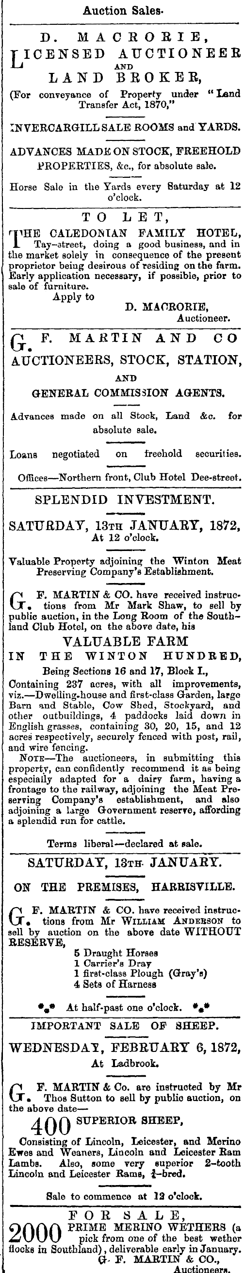 Auction SalesD. MACRORIE, TICENSED AUCTIONEER I~* AXD LAND BROKER, (For conveyance of Property under " Land Transfer Act, 1870," INVERCARGILL SALE ROOMS and YARDS. ADVANCES MADE ON STOCK, FREEHOLD PROPERTIES, &c, for absolute sale. Horse Sale in the Yards every Baturday at 12 o'clock. TO LET, T^HE CALEDONIAN FAMILY HOTEL, Tay— street, doing a good business, and in the market solely in consequence of the present proprietor being desirous of residing on the farm. Early application necessary, if possible, prior to sale of furniture. Apply to D. MAORORIE, Auctioneer. n ¥. MARTIN AND cIT AUCTIONEERS, STOCK, STATION, AND GENERAL COMMISSION AGENTS. Advances made on all Stock, Land &c for absolute sale. Loans negotiated on freehold securities. Offices — Northern front, Club Hotel Dee-street. SPLENDID INVESTMENT. SATURDAY, 13th JANUARY, 1872, At 12 o'clock. Valuable Property adjoining the Winton Meat Preserving Company's Establishment. GF. MARTIN & CO. have received instruc- • tions from Mr Mark Shaw, to sell by public auction, in the Long Room of the Southland Club Hotel, on the above date, hia VALUABLE FARM IN THE WINTON HUNDRED, Being Sections 16 and 17, Block 1., Containing 237 acres, with all improvements, viz. — Dwelling-house and first-class Garden, largo Barn and Stable, Cow Shed, Stockyard, and j other outbuildings, 4 paddocks laid down in English grasses, containing 30, 20, 15, and 12 acres respectively, securely fenced with post, rail, and wire fencing. Note — The auctioneers, in submitting this property, can confidently recommend it as being especially adapted for a dairy farm, having a frontage to the railway, adjoining the Meat Preserving Company's establishment, and also adjoining a large Government reserve, affording a splendid run for cattle. Terms liberal— declared at sale. SATURDAY, 13th JANUARY. ON THE PREMISES, HARRISVILLE. GF. MARTIN & CO. have received instruc- • tions from Mr Wilsiam Andebson to sell by auction on the above date WITHOUT RESERVE, 5 Draught Horses 1 Carrier's Dray 1 first-class Plough (Gray's) 4 Sets of Harness %• At half-past one o'clock. * # # IMPORTANT SALE OF SHEEP] WEDNESDAY, FEBRUARY 6, 1872, ] At Ladbrook. j GF. MARTIN & Co. are instructed by Mr • Thos Sutton to sell by public auction, on the above date — 4-00 SX7PERIOR SHEEP, | Consisting of Lincoln, Leicester, and Merino Ewes and Weaners, Lincoln and Leicester Ram Latnba. Also, some very superior 2-tooth Lincoln and Leicester Rams, £-bred. : Sale to commence at 12 o'clock. FOR SALE, QAAA PRIME MERINO WETHERS (a £j\) \J \J pick from one of the best wether flocks in Southland) , deliverable early in January. ! G- F. MARTIN & CO., I Auctioneers. I