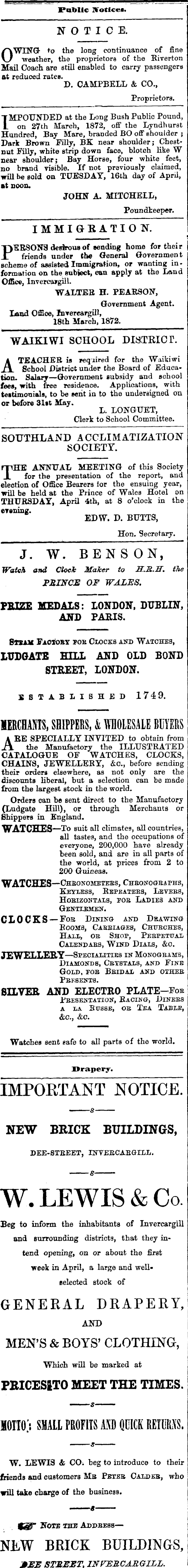 Public arotfcea. NOTICE. OWING to the long continuance of fine ■weather, the proprietors of the Riverton Mail Coach are still enabled to carry passengers at reduced rates. D. CAMPBELL & CO., Proprietors. "IMPOUNDED at the Long Bush Public Pound, L on 27th March, 1872, off the Lyndhurst Hundred, Bay Mare, branded BO off shoulder ; Dark Brown Filly, BK near shoulder; Chestnut Filly, white strip down face, blotch like W near shoulder; Bay Horse, four white feet, no brand visible. If not previously claimed, will be sold on TUESDAY, 16th day of April, at noon. JOHN A. MITCHELL, Poundkeep»r. IMMIGRATION. T)ERSON3 desirous of sending home for their _L friends under the General Government scheme of assisted Immigration, or wanting in • formation on the subject, can apply at the Land Office, Invercavgill. WALTER H. PEARSON, Government Agent. Land Office, InTereargill, 18th March, 1872. WAIKIWI SCHOOL DISTRICT. A TEACHER is required for the Waikiwi School District under the Board of Education. Salary — Government subsidy and school fees, with free residence. Applications, with testimonials, to be sent in to the undersigned on or before 31«t May. L. LONGUET, Clerk to School Committee. SOUTHLAND ACCLIMATIZATION SOCIETY. THE ANNUAL MEETING- of this Society for the presentation of the report, and election of Office Bearers for the ensuing year, will be held at the Prince of Wales Hotel on THURSDAY, April 4th, at 8 o'clock in the craning. EDW. D. BUTTS, Hon. Secretary. J. W. BENSON, Watch and Clock Maker to K.B.S. the P&INCE OF WALES. PEIZE MEDALS: LONDON, DUBLIN, AND PARIS. BXKUC Faotoby job Clocks and Watches, LUDGATE HILL AND OLD BOND STREET, LONDON. ESTABLISHED 1749. MERCHMTS, SHIPPERS, & WHOLESALE BITERS AEE SPECIALLY INVITED to obtain from the Manufactory the ILLUSTRATED CATALOGUE OF WATCHES, CLOCKS, CHAINS, JEWELLERY, &c, before sending their orders elsewhere, as not only are the discounts liberal, but a selection can be made from the largest stock in the world. Orders can be sent direct to the Manufactory (Ludgate Hill), or through Merchants or Shippers in England. WATCHES — To suit all climates, all countries, all tastes, and the occupations of everyone, 200,000 have already been sold, and are in all parts of the world, at prices from 2 to 200 Guineas. WATCHES — Chbonometebs, Chbonog-baphs, Keyless, Repeaters, Levees, hobizontals, joe ladie3 and Gentlemen. CLOCKS — Fob Dining and Drawing Booms, Cabbiages, Chttbches, Hail, ob Shop, Pebpetual Calendabs, Wind Dials, &o. JEWELLERY — Specialities in Monogbams, Diamonds, Cbtstals, and Fine Gold, fob Bbidax and otheb Pbesents. SILVER AND ELECTRO PLATE— Fob pbesentation, racing, dlnebs a la Bttsse, ob Tea Table, &c, &c. Watches sent safe to all parts of the world. Drapery. IMPORTANT NOTICE. s NEW BRICK BUILDINGS, DEE-STEEET, IUTEECAEGrLL. S W. LEWIS & Co Beg to inform the inhabitants of Invercargill and surrounding districts, that they intend opening, on or about the first week in April, a large and wellselected stock of GENERAL DRAPERY, AND MEN'S & BOYS' CLOTHING, Which will be marked at PRICESITO MEET THE TIMES. MOTTO) SMALL PROFITS MD QUICK RETURNS. W. LEWIS & CO; beg to introduce to their friends and customers Mb Peteb Caldeb, who will take charge of the business. %gT IfOXK THE ADDBESS — NEW BRICK BUILDINGS, MXJB STMEJBT, INFJEBCABGILL.