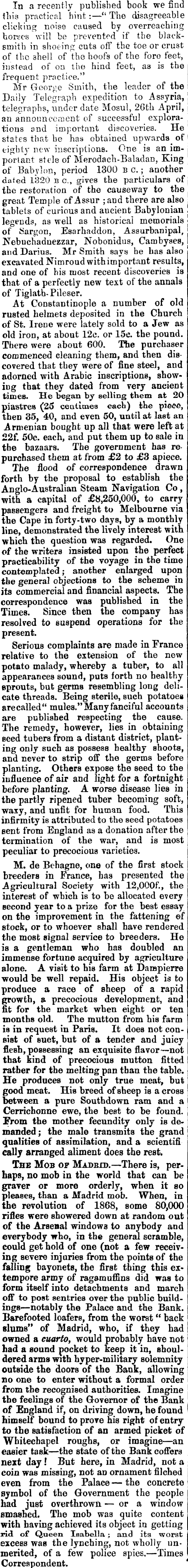 In a recently published book we find this practical hint : — " The disagreeable clicking nois9 caused by overreaching horses will be prevented if the blacksmith in shoeing cuts off the toe or crust of the shell of the hoofs of the fore feet, instead of on the hind feet, as is the frequent practice." Mr Goorge Smith, the leader of the Daily Telegraph expedition to Assyria, telepraphs, under date Mosul, 26th April, an announceoient of successful explorations and important discoveries. He states that he has obtained upwards of eighty new inscriptions. One is an important stele of Merodach-Baladan, King of Babylon, period 1300 B c. ; another dated 1320 b c, gives the particulars of the restoration of the causeway to the great Temple of Assur ;and there are also tablets of curious and aucient Babylonian legends, as well as historical memorials • of Sargon, Esarhaddon, Assurbanipal, Nebuchadnezzar, Nobonidus, Cambyses, j and Darius. Mr Smith says he has also excavated Nimroud withimportant results, and one of his most recent discoveries is that of a perfectly new text of the annals of Tiglath- Pileser. At Constantinople a number of old rusted helmets deposited in the Church of St. Irene were lately sold to a Jew as old iron, at about 12c. or 15c. the pound. There were about 600. The purchaser commenced cleaning them, and then discovered that they were of fine steel, and adorned with Arabic inscriptions, showing that they dated from very ancient times. He began by selling them at 20 piastres (25 centimes each) the piece, then 35, 40, and even 50, until at last an Armenian bought up all that were left at 22f. 50c. each, and put them up to sale in the bazaars. The government has repurchased them at from £2 to £3 apiece. The flood of correspondence drawn forth by the proposal to establish the Anglo- Australian Steam Navigation Co , with a capital of £8,250,000, to carry passengers and freight to Melbourne via the Cape in forty-two days, by a monthly line, demonstrated the lively interest with which the question was regarded. One of the writers insisted upon the perfect practicability of the voyage in the time contemplated; another enlarged upon the general objections to the scheme in its commercial and financial aspects. The correspondence was published in the Times. Since then the company has resolved to suspend operations for the present. Serious complaints are made in France relative to the extension of the new potato malady, whereby a tuber, to all appearances sound, puts forth no healthy sprouts, but germs resembling long delicate threads. Being sterile, such potatoes arecalled" mules." Many fanciful accounts are published respecting the cause. The remedy, however, lies in obtaining seed tubers from a distant district, planting only such as possess healthy shoots, and never to strip off the germs before planting. Others expose the seed to the influence of air and light for a fortnight before planting. A worse disease lies in the partly ripened tuber becoming soft, waxy, and unfit for human food. This infirmity is attributed to the seed potatoes sent from England as a donation after the termination of the war, and is most peculiar to precocious varieties. M. de Behagne, one of the first stock breeders in France, has presented the Agricultural Society with 12,000 f., the interest of which is to be allocated every second year to a prize for the best essay on the improvement in the fattening ©f stock, or to whoever shall have rendered the most signal service to breeders. He is a gentleman who has doubled an immense fortune acquired by agriculture alone. A visit to his farm at Darapierre would be well repaid. His object is to produce a race of sheep of a rapid growth, a precocious development, and fit for the market when eight or ten months old. The mutton from his farm is in request in Paris. It does not consist of suet, but of a tender and juicy flesh, possessing an exquisite flavor — not that kind of precocious mutton fitted rather for the melting pan than the table. He produces not only true meat, but good meat. His breed of sheep is a cross between a pure Southdown ram and a Cerrichonne ewe, the best to be found. From the mother fecundity only is demanded ; the male transmits the grand qualities of assimilation, and a scientifi cally arranged aliment does the rest. The Mob op Madbis. — There is, perhaps, no mob in the world that can be graver or more orderly, when it so pleases, than a Madrid mob. When, in the revolution of 1868, some 80,000 rifles were showered down at random out of the Arsenal windows to anybody and everybody who, in the general scramble, could get hold of one (not a few receiving severe injuries from the points of the falling bayonets, the first thing this extempore army of ragamuffins did was to form itself into detachments and march off to post sentries over the public buildings — notably the Palace and the Bank. Barefooted loafers, from the worst " back shuns" of Madrid, who, if they had owned a cuarto, would probably have not had a sound pocket to keep it in, shouldered arms with hyper-military solemnity outside the doors of the Bank, allowing no one to enter without a formal order from the recognised authorities. Imagine the feelings of the Governor of the Bank of England if, on driving down, he found himself bound to prove his right of entry to the satisfaction of an armed picket of Whitecbapel roughs, or imagine — an easier task — the state of the Bank coffers next day ! But here, in Madrid, not a coin was missing, not an ornament filched even from the Palace — the concrete symbol of the Government the people had just overthrown. — or a window smashed. The mob was quite content with having achieved its object in getting rid of Queen Isabella ; and its worst excess was the lynching, not wholly unmerited, of a few police spies. — Times Correspondent.