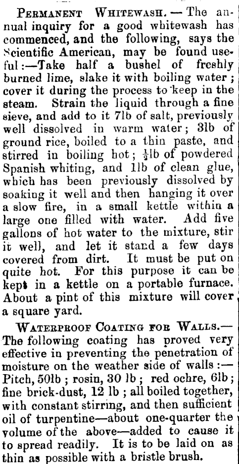 ! Pebmanent Whitewash. — The annual inquiry for a good whitewash has commenced, and the following, says the Scientific American, may be found useful :— Take half a bushel of freshly burned lime, slake it with boiling water ; cover it during the process to 'keep in the steam. Strain the liquid through a fine sieve, and add to it 71b of salt, previously well dissolved in warm water ; 31b of ground rice, boiled to a thin paste, and stirred in boiling hot ; £lb of powdered Spanish whiting, and lib of clean glue, which has been previously dissolved by soaking it well and then hanging it over a slow fire, in a small kettle within a large one filled with water. Add five gallons of hot water to the mixture, stir it well, and let it stand a few days covered from dirt. It must be put on quite hot. For this purpose it can be kepi in a kettle on a portable furnace. About a pint of this mixture will cover a square yard. Watebpboof Coating fob "Walls. — The following coating has proved very effective in preventing the penetration of moisture on the weather side of walls : — Pitch, 501 b ; rosin, 30 lb ; red ochre, 61b ; fine brick-dust, 12 lb ; all boiled together, with constant stirring, and then sufficient oil of turpentine — about one-quarter the volume of the above — added to cause it to spread readily. It is to be laid on as thin as possible with a bristle brush.