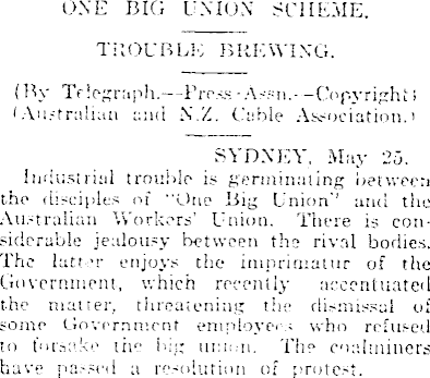 ONE BIG UNION SCHEME. TROUBLE BREWING. (By Telegraph.—Press: - Assn.- -Copyright i I Australian and N.Z. Gable Association. > SYDNEY, May 23. Industrial trouble is germinating between the disciples of "vine Big Union” ami the Australian Workers’ LTiion. There is considerable jealousy between the rival bodies. The latter enjoys the imprimatur of the Government, which recently accentuated the matter, threatening the dismissal of some Government employee-.; who refused to forsake the lug union. The coalminers have pa.-sed a resolution of protest.