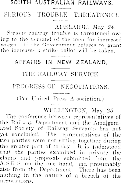 SOUTH AUSTRALIAN RAILWAYS. SERIOUS TROUBLE THREATENED. ADELAIDE, May 24. Serious railway trouble is threatened owing to the demand of the men for increased wages. If the Government refuses to grant the increase,- a strike ballot will be taken. AFFAIRS IN NEW ZEALAND. THE RAILWAY SERVICE. PROGRESS OF NEGOTIATIONS. (Per United Press Association.) WELLINGTON, May. 23. The conference between representatives of the Railway Department nnd the Amalgamated Society of Railway Servants has not yet concluded. The representatives of the two parties were not sitting together during the greater part of to-day. It is jnderstood that the parties examined in private the claims and proposals submitted from the A.S.R.r-. on the one hand, and presumably also from the Department. There has been nothing in the nature of a breach of the negotiations.