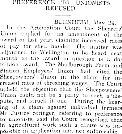 PREFERENCE TO UNIONISTS REFUSED. BLENHEIM, May 24. _ln the Arbitration Court the Shearers’ Union applied for an amendment of the award of last year, claiming increased rates of pay for shed hands. The matter was adjourned to Wellington to be heard next month as the award in question is a dominion award. The Marlborough Farm and Station Employees’ Union had cited the Sheepowners’ Union in the claim for increased rates of threshing wages. The Court upheld the objection that the Sheepowners’ Union could not be a party to such a’dispute, ard struck it out. During the hearing of a claim against individual fanners Mr Justice Stringer, referring to preference to unionists, said the Court recognised that in agricultural work such a clause was impossible in application and not enforceable.