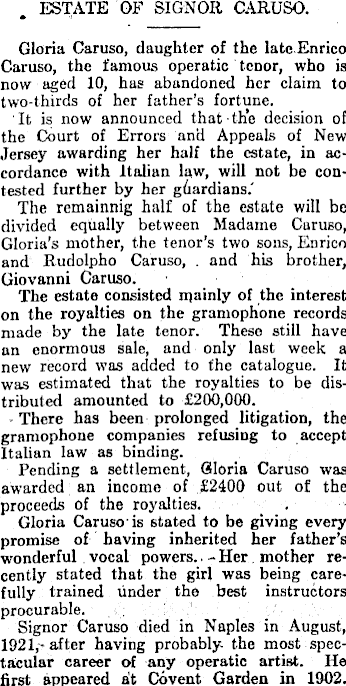 ESTATE OF SIGNOR CARUSO. Gloria Caruso, daughter of the late Enrico Caruso, the famous operatic tenor, who is now aged 10, has abandoned her claim to two-thirds of her father's fortune. It is now announced that-the decision of the Court of Errors and Appeals of New Jersey awarding her half the estate, in accordance with Italian law, will not be contested further by her gfiardians.' The remainnig half of the estate will be divided equally between Madame Caruso, Gloria’s mother, the tenor’s two sons, Enrico and Rudolpho Caruso, . and his brother, Giovanni Caruso. The estate consisted rpainly of the interest on the royalties on the gramophone records made by the late tenor. These still have an enormous sale, and only last week a new record was added to the catalogue. It was estimated that the royalties to be distributed amounted to £200,000. There has been prolonged litigation, the gramophone companies refusing to accept Italian law as binding. Pending a settlement, Gloria Caruso was awarded an income of £2400 out of the proceeds of the royalties. Gloria Caruso is stated to be giving every promise of having inherited her father’s wonderful vocal powers. -Her mother recently stated that the girl was being carefully trained under the best instructors procurable. Signor Caruso died in Naples in August, 1921,-after having probably- the most spectacular career of any operatic artist. He first appeared at Covent Garden in 1902.