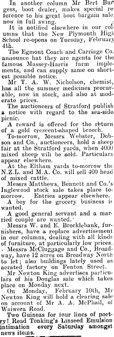 In another column Mr Bert Burgess, boot dealer, makes special reference to his great boot bargain sale, now in full swing. , It is notified elsewhere in our columns that tiie New Plymouth High School rc-opens on Tuesday, February 4th. The Egmont Coach and Carriage Co. announce hat they are agents for the famous Massey-Harris farm implements, and can supply same on shortest possible notice. Mr T. A. W. Nicholson, chemist, has all the summer medicines procurable, now in stock, and also at moderate prices. The auctioneers of Stratford publish a notice with regard to the sea-side picnic. A reward is offered for the rbturn of a gold crescent-shaped brooch. To-morrow, Messrs Webster, Dobson and Co., auctioneers, Hold a sheep fair at the Stratford yards, when 4000 mixed sheep will be sold. Particulars appear elsewhere. At the Eltham yards to-morrow the N.Z.L. and M.A. Co. will sell 400 head of mixed cattle. Messrs Matthews, Bennett and Co.’s Inglewood stock sale takes place tomorrow. Entries appear elsewhere. A boy for the grocery business is wanted. A good general servant and a married couple are wanted. ’ Messrs W. and E. Brocklebank, furnishers, have a replace advertisement in our columns, dealing with all kinds of furniture, at particularly low prices. • Messrs McCluggage and Co., Broadway, have 12 acres on Broadway North to let; also buildings lately used as aerated factory on Fenton Street. Mr Newton King advertises particulars of his Douglas sale which takes place on Monday next. On Monday, February 10th, Mr Newton King will hold a clearing sale on account of Mr A. A.. McPhail, oi Waiwera Road. Two Guineas for four lines of poetry! Read Tonkiug’s Linseed Emulsion intimation every Saturday amongst news items. _________