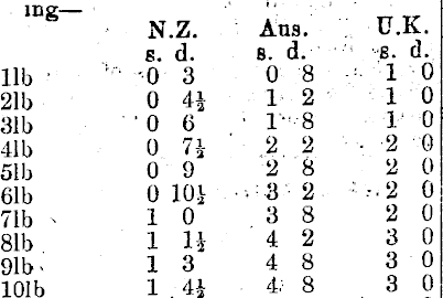 POSTAL RATES. Letters and Letter Cards.—lnland, | including Cook Islands, id tor each 4ok ( ,r fraction thereof, and Jd for | each succeeding 2oz. United Kingdom, j British Possessions, United States, Chili, Costa Rica, Egypt, Italy, Mexi- j co, Nicaragua, Nigeria, Peru, 1 ago ; Pago, Paraguay. Portugal, and Portu- j rruese Colonies, Siam, bervia, and Postal Agencies in Chinese Treaty ] Portsy id for each oz. or fraction thereof; all other places 2id for the first oz. or fraction tuereof, and lid for each succeeding oz. or fraction thereof. . Post Cards Inland, single, Id; reply, Id; all other, places, single, id; reply 2d. Printed Papers paciuding Books and Magazines, not registered).—All places, id per 3oz• Magazines (registered), inland, id for every ,Boz or fraction thereof. Foreign, id per 2oz or fraction thereof. Ono end must be left open. Commercial Papers—lown (.for accounts, etc., only), id for 20/.s, or Id ior first 4oz ami id each succeeding 2oz. Inland, id for first 4oz, and id for each succeeding 2oz. All other places lOoz 2|d, and id for every additional 2oz (Open for inspection). Newspapers.—Town and Inland, jd each. United Kingdom, Australia, Canada, Ceylon, Ind.a, Jamaica, Natal, Orange River, South Sea Islands, and Transvaa', Id each paper. If undei Boz sent Ay first available route; over Soz sent by direct steamer only, unless specially addressed and paid at rate of Id for first 4oz and id tor each succeeding 2oz. All other places Id each under 4oz and id eacl extra 2oz. Pattern and Sample Packets. —Inland, id first 2oz or fractim thereof; over 2oz as for “all other places.” All •>ther places, Id first 4oz, every additional 2oz or fraction id. Registration.—2d additional for all. places. PARCEL POST. Parcels posted in the Dominion for delivery in New Zealand, not exceed-