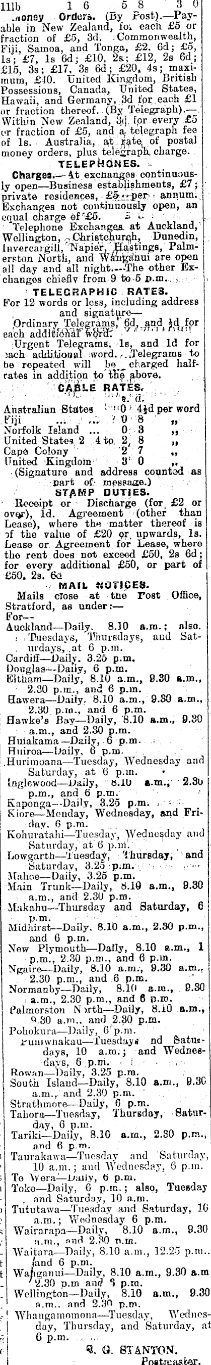 111 b 16 _ 5 8 3 0 .'ionsy Orders, (uy Post). —Payable in New Zealand, for each £5 or fraction of £5, 3d. Commonwealth, Fiji, Samoa, and Tonga, £2. Gd; £5, Is ; £7, Is 6d; £lO. 2s; £l2, 2s 6d ; £ls, 3s; £l7. 3s 6d ; £2O, 4s; maximum, £lO. United Kingdom, British j Possessions, Canada, United States, | Hawaii, and Germany, 3d for each £1 or fraction thereof. (By Telegraph).— Within New Zealand, 3<] for every £5 or fraction of £5, and a; telegraph fee of Is. Australia, at of postal money orders, plus telegraph charge. TELEPHONES. Charges.— At exenanges continuously open—Business establishments, £7 ; private residences, - --per annum. j Exchanges not continuously open, an equal charge df £6. £ . Telephone Exchanges at Auckland, Wellington, Christchurch, Dunedin, Invercargill, Napier, Hastings, Palmerston North, and Wangsmui are open all day and all night.—The other Exchanges chieflv from 9 to 5 i>.m. TELEGRAPHIC RATES. For 12 words or less, including address and signature— Ordinary Telegrams,' 6d, and Jd for each additiohiiT (vb'r'dt Urgent Telegrams, Is, and Id for iach additional word., .Telegrams to he repeated will be _ charged halfrates in addition to tHe above. CABLE RATES, “ ''9.' a. Australian States M o f 4Jd per word Fiji ... ... HI 8 „ Norfolk Island ... 0 3 ~ United States 2 4to 2 8 ~ Cape Colony 2 7 „ United Kingdom 3 1 0 ~ (Signature and address counted as part of rapssaae.) STAMP DUTIES. Receipt or Discharge (for £2 or Lease), where the matter thereof is if the value of £2O or upwards, Is. Lease or Agreement for Lease, where the rent does not exceed £SO, 2s 6d; for every additional £SO, or part of £SO. 2s. MAIL NOTICES. Mails close at tne Post Office, Stratford, as under : For— Auckland—Daily. 8.10 a.in.; also. Tuesdays, Thursdays, and Saturdays, .at 6 p.m. Cardiff—Daily. 3.25 p.m. Douglas—Daily, 6 p.m. Eltham—Daily, 8.10 a.m., 0.30 a.m., 2.30 p.m., and 6 p.m. Hawera—Daily. 8.10 a.m., 9.50 a.m., 2.30 p ro., and 6 p.m. Hawke’s Bay—Daily, 8.10 a.m., 9.80 a.m., and 2.30 p.m. Huiakama—Daily, 6 p.m. Huiroa—Daily, 6 p.m. Hurimoana —Tuesday, Wednesday and Saturday, at G p.m. Inglewood—Daily, tt.lo »-m., 2.3 U p.m., and 6 p.m. Kaponga—Daily, 3,25 p.m. Kiore—Monday, Wednesday, and Friday. 6 p.m. Kohuratahi—Tuesday, Wednesday and Saturday, at G p.iri. Lowgartb—Tuesday, Thursday, and Saturday, 3.25 p.m. Mahoe—Daily, 3.25 p.m. Main Trunk—Daily, 8.10 a.m., 9.30 a.m., and 2.30 p.m. Makahu—Thursday and Saturday, 6 p.m. Midhirst—Daily. 8.10 a.m., 2.30 p.m., and 6 p.m. Now Plymouth—Daily, 8.10 a.m., 1 p.m., 2.30 p.m., and 6 p.m. Ngaire—Daily, 8.10 a.m., 9.30 a.m., 2.30 p.m., and 6 p.m. Normanby—Daily, 8.10 a.m., 0.80 a.m., 2.30 p.m., and 6 p.ro. Palmerston N irth—Daily, 8.10 a.m., Q 30 a.m.. and 2.30 p.m. Pobokura—Daily, G p.m. i'uniwnakau —Tuesdays nd Satmdays, 10 a.m.; and Wednesdays. 6 p.m. Rowan—Daily, 3.25 p.m. South Island—Daily, 8.10 a.m., 9.30 a.m., and 2.30 p.m. Strathmore—Daily, G p.m. 1 Tahora—Tuesday, Thursday, Saturday, 6 p.m. - Tariki—Daily, 8.10 a.m.. 2.80 p.m., and G p.m. s Taurakawa—Tuesday and Saturday, 1 10 a.m.; and Wednesday, 6 p.m. s To Worn—Daily, G p.m. i Toko—Daily, 6 p.m.; also, Tuesday ; and Saturday, 10 a.m. □ Tututawa—Tuesday and Saturday, IC c a.m.; Wednesday 6 p.m. s Wairarapa—Daily, 8.10 a.m., 9.30 | v a.m., and 2.30 p.m. - Waitara —Daily, 8.10 a.m., 12.25 p.m.. t /and 6 p.m. t Wanganui— Daily, 8.10 a.m., 9.30 a.m ' 2.30 p.m ami l 5 p.ra. !_ ■ Wellington—Daily, 8.10 a.m., 9.30 1 a.m,. and 2.3 G p.m. 1 Whangarnomona—Tuesday, Wedncs- ; | day, Thursday, and Saturday, at eij 6 p.m. cl 9. «. STANTON, i Postmaster.