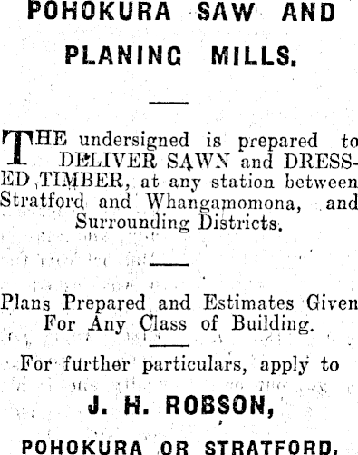 POHOKURA SAW AND PLANING MILLS. THE undersigned is prepared to DELIVER SAWN and DRESSED ,TIMBER, at any station between Stratford and Whangapiomona, and Surrounding Districts. Plans Prepared and Estimates Given For Any Class of Building. For further particulars, apply to J. H. ROBSON, POHOKURA OR STRATFORD.