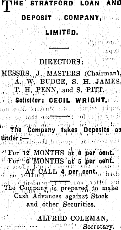 HE STRATFORD LOAN AND DEPOSIT COMPANY, LIMITED, - In j • DIRECTORS: MESSRS. J. MASTERS (Chairman), A. : W. BUDGE, S. H. JAMES, T. ,H. PENN, and S. PITT. . Solicitor: CECIL WRIGHT. i rin-,;m-Jv. •) n n■ : i i . >r iid: 1 -i-y.r-rr —~ . Al , v ! h: Thebompany takesDepqsltsaa under;—' I - ■ • :»dt> ■> ;u ‘ ■ Jp ■ Al; ■’ ; * ; ‘For lit 1 MONTHS at Is per bent. 1 f FoF“ d MONTHS At’ Bjper cent. -■•; y, \ ‘ ; H‘) L‘U IC'- : ■■) 11)07 Cilij l ! j'tt The Company .is to . njak-e Cash Advances against Stock and other Securities. ALFRED COLEMAN, f Secretary.