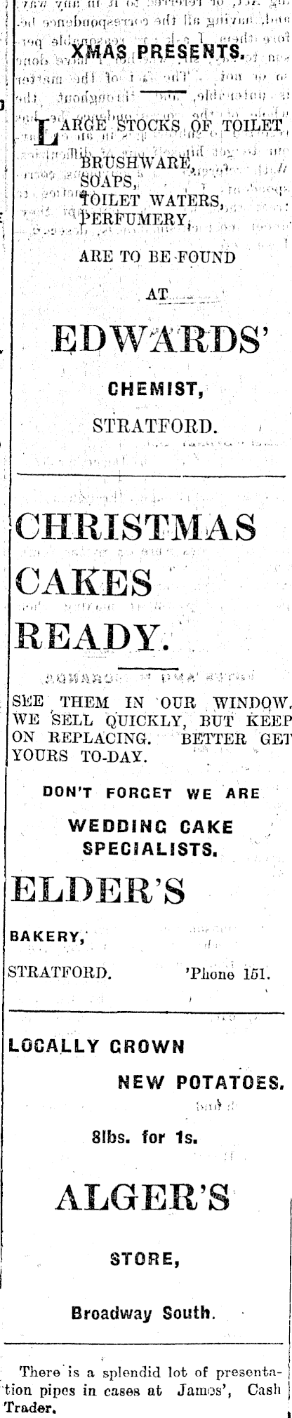 .7/;*// vfin Ilf ii (>’.! : i'fiite i *io f j w _• k( vin'ykn()<W Tl ‘ :aL Sift gitivni; '' 7!; iniPutf ■sH 1 "ic t u ’ti’i* 1 i" ' (<■ i mil 1 '=-■">■" t ■ !£!( f ■ I’ AltGfe STOCKS OF TOILET A ■ 11; ' BRUSH WARIt / ’ So'aps, tOXLET WATERS, ’Perfumery, ARE TO BE FOUND AT ... EDWARDS’ CHEMIST, STRATFORD. CHRISTMAS CAKES READY.' OVi M, tft I; - -■ ,J V**4 & ‘ *'f ' - ;; ■ ■ SEE THEM IN OUR WINDOW, WE SELL QUICKLY, BUT KEEP ON REPLACING. BETTER GET YOURS TO-DAY. DON’T FORGET WE ARE WEDDING CAKE SPECIALISTS. ELDERS BAKERY, STRATFORD. ’Plume 161. LOCALLY GROWN NEW POTATOES. hnW B!bs. for Is. ALGER’S STORE, Broadway South. There is a splendid lot of presonta- 1 ! tion pipes in cases at James’, Cash | i Trader.