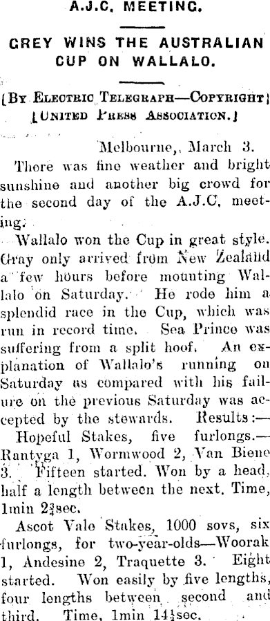 A.J.C. MEETING. CREY WINS THE AUSTRALIAN CUP ON WALLALO. [By Eleothio Teleghaph—Copybight| I United JruEßt) Association.] Melbourne,, March 3. There was fine weather and bright sunshine and another big crowd for the second day of the A.J.C. meeting. Wallalo won the Cup in great style. Cri'ay only arrived from New Zealand a few hours before mounting Wallalo on Saturday. Ho rode him a splendid race in the Cup, which was run in record time. Sea Prince was suffering from a split hoof. An explanation of Wallalo's running on Saturday as compared with his failure on the previous Saturday was accepted by the stewards. Kesults:— Hopeful Stakes, five furlongs.— Rantyga 1, Wormwood 2, Van Biene 3. 'Fifteen started. Won by a head, half a length between the next. Time, lrain 2|sec. Ascot Vale Stakes, 1000 sovs, six furlongs, for two-year-olds—Woorak 1, Andesine 2, Traquette 3. Eight started. W r on easily by five lengths, four lengths between second and third. Time, Imin 14isec.