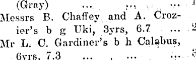 (Gray) ... ~, •■■ ' Messrs B. Chaffey and A. Crozier's b g Uki, 3yrs, 6.7 ... 2 Mr L. 0. Gardiner's b li Calabus, 6yrs, 7.3 ... , ... ••■ 3