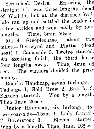 Scratched. Desire. Entering the straight Uki was three lengths ahead of Wallalo, but at the distance \Vallalo ran up and settled the leader in a few strides and won easily by four length's. Time, 3min 56sec. March Steeplechase, about two miles.—Bettwynd and Platta (dead heat) 1, Camasade 3. Twelve started. An exciting finish, the third horse four lengths away. Time, 4min 53 sec. The winners'divided the prize money. Bourke Handicap, seven furlongs.— Tadanga 1, Gold Brew 2, Brattle 3. Sixteen started. Won by a length. Time lmin 2Gsec. Junior Handicap, six furlongs, for two-year-olds—Toast 1, Lady Cantab 2, Baverstock 3. Eleven started. Won by a length. Time, lmin lGiJsec.