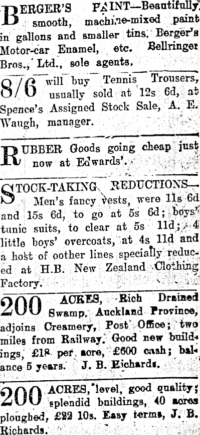BERGER’S F^INT— Beautifully! smooth, machnue-mixed paint in gallons and smaller tins. Berger’s Motor-car Enamel, etc. Bellringer Bros.,' Ltd., sole agents. q j will buy Tennis Trousers, 0/0 usually sold at 12s 6d, at Spence’s Assigned Stock Sale, A. E. Waugh, manager. RUBBER Goods going cheap just now at Edwards’. TOCK-TAKING REDUCTIONS— Men’s fancy Vests, were 11s 6d and 15s 6d, to go at os 6d; boys tunic suits, to clear at 5s lid; 4 little boys’ overcoats, at 4s Hd and a host of oother lines specially reduced at H.B. New Zealand Clothing Factory. - - ■■ qaa ACRES, ~Rich Drained JjKjXJ Swamp. Auckland Province, adjoins Creamery, Post Office; two miles from Railway. Good new build-, ings, £l* per sore, £6OO cash; h»L ance 5 years. J. B. Richards. ACRES,‘level, good quality; splendid buildings, 40 aorea ploughed, £22 10s. Easy terms, JT. B. Richards.