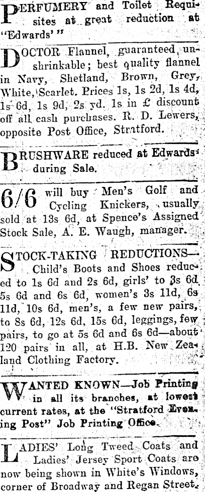 PERFUMERY and Toilet Requisites at great reduction at “Edwards’ ” TAOCTOR Flannel, guaranteed, unIJ shrinkable; best quality flannel in Navy, Shetland, Brown, Grey, White,'Scarlet, Prices Is, Is 2d, Is 4d, Is Gd, Is 9d, 2s yd. Is in £ discount off all cash purchases. R. D. Lewers, opposite Post Office, Stratford. BRUSHWARE reduced at Edwardsduring Sale. nj p will buy Men’s Golf and O/O Cycling Knickers, .usually sold at 13s* 6d, at Spence’s Assigned Stock Sale, A. E. Waugh, manager. STOCK-TAKING REDUCTIONS— Child’s Boots and Shoes reduced to Is Gd and 2s 6d, girls’ to £s 6d os Gd and 6s 6d, women’s 3s lid, 6s lid, 10s 6d, men’s, a few new pairs, to Ss 6d, 12s 6d, 15s Cd, leggings, few pairs, to go at 5s Gd and 6s Gd—about' 120 pairs in all, at H.B. New Zea-t land Clothing Factory. WANTED KNOWN—Job Prmfcinf in all its branches, at lowtrt current rates, at the “Stratford Ev«JU ing Post” Job Printing Offioe. T ADI ES’ Long Tweed Coats and 1J Ladies’ Jersey Sport Coats are now being shown in White’s Windows, corner of Broadway and Regan Street..