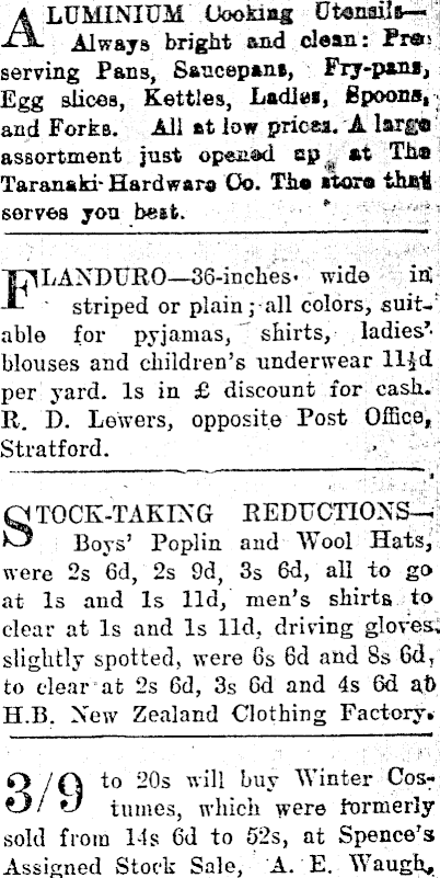 Aluminium uookmg otomiin— Always bright and clean: i"reserving Pans, Saucepans, Fry-pana, Egg slices, Kettles, Ladle*, Spoons, and Forks. Ail at low price*. A large assortment just opened op at Th® Taranaki- Hardwars Go. The etore thflU serves you best. LANDUR 0—36-inches- wide id striped or plain; all colors, suitable for pyjamas, shirts, ladies’ blouses and children’s underwear Hid per yard. Is in £ discount for cash. R. D. Lowers, opposite Post Office, Stratford. STOCK-TAKING REDUCTIONS— Boys’ Poplin and Wool Hats, were 2s Gd, 2s 9d, 3s 6d, all to go at Is and Is lid, men’s shirts to clear at Is and Is lid, driving gloves, slightly spotted, were (is 6cl arid 8s Gd, to clear at 2s 6d, 3s Gd and 4s 6d at) H.B. New Zealand Clothing Factory. 3/Q to 20s will buy Winter Cos- ‘ *-J tunics, which were formerly sold from 1-ls 6d to 525, at Spence’s Assigned Stock Sale, A. E. Waugh*