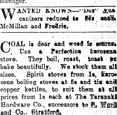 WAiNTEiI HINU Vaf IN —* - iiot" *n» c&nizers reduced is SSs ©silk McMillan and Freiris, OAL is dear and wo®s Is MVnWi Use a Forfcotio* tcroMoa stove. They boil, roait, tout W bake beautifully. We stock tit®En ail sizes. Spirit stoves from Is, Heron sene boiling stoves at 6s and tis£ and copper kettles, to suit them at ell prices from Is each at The Taruaki Hardware Co., successors to wtm and 00.. Sferitforis