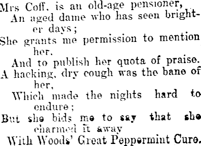 Mrs ColY. is an old-age pensioner. An aged dame who has seen brighter days; She grants me permission to mention her. And to publish her quota of praise. A hacking, dry cough was the bane of her. Which made the nights hard to endure; But she bids ms to say that she charmed it away With Wood*’ Great Peppermint Cure,