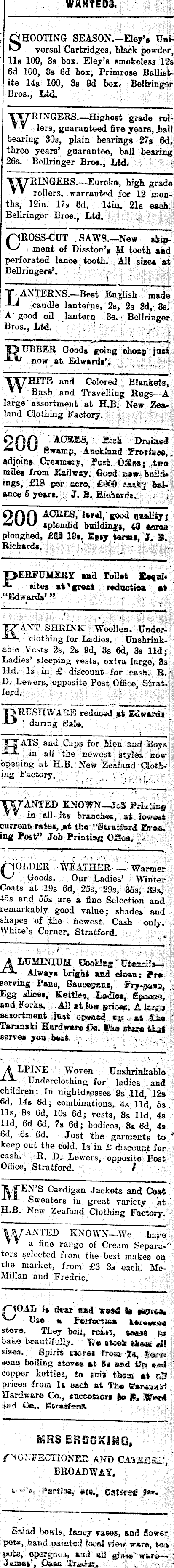 WANTEOB. SHOOTING SEASON.— Eley’s Uaiversal Cartridges, black powder, 11s 100, 3s box. Eley’s smokeless 12s 6d 100, 8s 6d box, Primrose Ballistite 14s 100, 3a 8d box. Bellringer Bros., Lid. WRINGERS.—Highest grade rol- * ’ lets, guaranteed fire years, .bail bearing 30s, plain bearings 27s 6d, three years’ guarantee, ball bearing 265. Bellringer Bros., Ltd. X/^TRINGERS. —Eureka, high grade ’ ’ rollers, warranted for 12 'months, 12in. 17s Od, l4in. 21s each. Bellringer Bros., Ltd. Cross-cut , saws.—New ship. ment of Disston’g M tooth and perforated lance tooth. All sizes at Bellringers*. T ANTERNS.—Best English made -*-■ candle lanterns, 2s, 2s Bd, 3s. A good oil lantern Ss. Bellringer Bros., Ltd. "O ÜBEER Goods going cheap just now at Edwards’. TXTHITE and Colored Blankets, * » Bush and Travelling Rugs—A large assortment at H.B, New Zealand Clothing Factory. 200 ACSli’gi, Sick Drsiaai .•■l/u Swamp, Auckland Proviso®, adjoins Creamery, Pest OSfi©*; two miles from Railway, Good mw build* ings, £lB per aero, £#»)» taitj- sal. ance 5 years. J. B. Richards, OAf] ACRES, !*»•!, good qudityj splendid building*, 49 ®aroa ploughed, £23 10«. Easy term*, S. 1. Richards. T>EEFUMSRY and Toilet i£oqai* -*■ “tea at ’ great rednotiea at “Edwards’ ” XT ANT SHRINK Woollen. Under- ■“ *■ clothing for Ladies. Unshrinkable \ ests 2s, 2s 9d, 3s 6d, 3s lid; Ladies’ sleeping vests, extra large, 3s lid. Is in £ discount for cash. B. D. Lowers, opposite Post Office Stratford. TJRUSHWABE reduced at Edwards •*-* during Sal®. ”OTATS' anu Caps for Men and Boys •*" •* in aii the newest styles now opening at H.B. New Zealand Clothing Factory. XyANTED KNOWN—Jsb Friating ' ’ in all its branches, at lomtl current rates, jat the “Stratford ttru. iag Post” Job Printing Ofka. OLDER WEATHER Warmer Goods. Our Ladies’ Winter Coats at 19s 6d, 255, 295, 355, 395, 45s and 65s are a fine Selection and remarkably good value ; shades and shapes of the newest. Cash only. White’s Corner, Stratford. A LUMINIUM Cooking Ui-snsr:!*— Always bright and dean: ftm. serving Pans, Saucepans, Fry-pans, Egg slices, Kettles, ;ua»il6s, SgtoOßS, aud Forks, All at low guises. A assortment just ttpenad up ai Taranaki Hard war® pa. Vita ster® thal serves you best A URINE Woven Unshrinks Underclothing for ladies j children: In nightdresses 9s lid, 6d, 14s 6d • combinations, 4s lid, Hs, 8s 6d, 10s 6d; vests, 3s lid, Hd, 6d 6d, 7s 6d; bodices, 8s b'd, bd, 6s 6d. Just the garments keep out the cold. Is in £ discount cash. R. I). Lowers, opposite P Office, Stratford. / Cardigan Jackets and Co Sweaters in great variety H.B. New Zealand Clothing Factor ANTED KNOWN—We bars a fine range of Cream Separators selected from the best makes on the market, from £3 3s each. McMillan and Fredric. f 10AL is dear «nd ■sujwS ta Us© % Perfection s« stove. They boil, roh*s, m bake beautifully, W® stock %l si Res. Spirit rtewi tank -Ji, sene boiling groves at fig usd i copper kettles, to suit ttwa prices from Is. each at Tins Si Hardware Co., successor* Iks Jl, .tiiid Gw., Rt-rwtfee#. MBS BROOKINi r'IGKFEOTIONEB AND C BROADWAY. PartlM,* •»., cati Salad bowls, fancy vases, sad fiov pots, hand minted local view ware, t pote, ©pergrioi, End ail glass war* Jameg’, Owm Trgtidss.