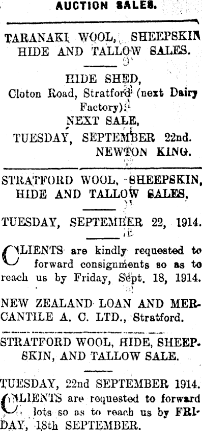 AUCTION SALES. TARANAKI WOOL, SHEEPSKIN HIDE AND TALLOW SALES. HIDE SHED, Cloton Road, StratfortF (next Dairy Factory) I* NEXT SALE, TUESDAY, SEPTEMBER 22nd. NEWTON KINO. STRATFORD WOOL, SHEEPSKIN, HIDE AND TALLOW BALES. TUESDAY, SEPTEMBER 22, 1914. C CLIENTS are kindly requested to J forward consignments so as to reach us by Friday, NEW ZEALAND LOAN AND MERCANTILE A. C. LTD., Stratford. STRATFORD WOOL. HIDeT SHEEP. SKIN, AND TALLOW SALE. TUESDAY, 22nd SEPTEMBER 1914. /i'ILIENTS are requested to forward / lots so as to roach us by FBI' DAY, I,Bth SEPTEMBER.