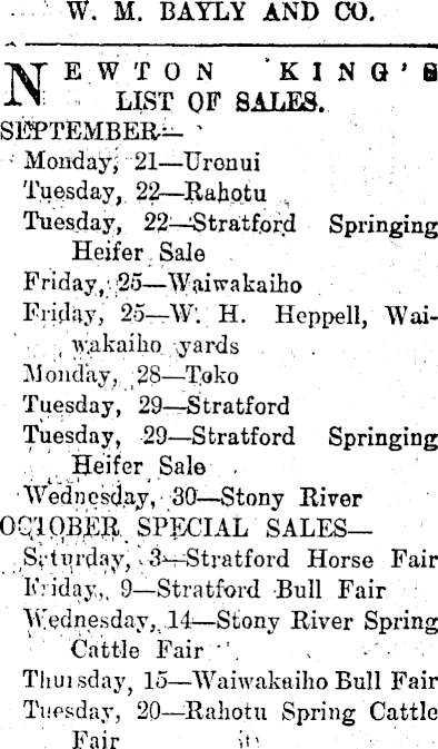 W. M. BAYLY AND CO. E W T 0 N KINO'S LIST OF SALES. SEPTEMBER— Monday, 21—Uronui Tuesday, 22—Rahotu Tuesday, 22—Stratford Springing Heifer Sale Friday, 25—Waiwakaiho Friday, 25—W. H. Heppell, Waiw.akaiho yards Monday, 28—Toko Tuesday, 29—Stratford Tuesday, 29—Stratford Springing Heifer Sale Wednesday, 30—Stony River OCTOBER SPECIAL SALES— Saturday, 3—Stratford Horse Fair Friday,, 9—Stratford Bull Fair Wednesday,, 14—Stony River Spring Cattle Fair Tliuisday, 15—Waiwakaiho Bull Fair Tuesday, 20—Rahotu Spring Cattle Fair it-