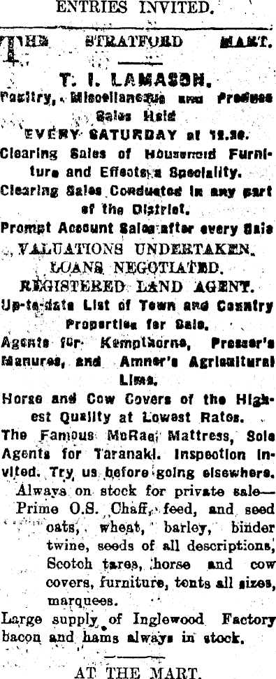 ENTRIES INVITED, f|lßß BTIiATFUAD MART. T. 8. LAMASaN.' Pacltry,.. Ml«o*llancafW« am ftMiu , W*s Held 'SVGUY- SATURDAY s( tl.S#, Clearing Sales of HOuserraid Furniture and EffootShS Speciality. Clearing Sales Condueted In any pari af the District. Prompt Account SalM after every 0i!» ... VALUATIONS UNDERTAKEN. LOANS NEGOTIATED. REGISTERED LAND AGENT. Up*te-d&ta List of Town and Cosntry Prapartlc« far Sale, Agents fur Kentpttoorne, Prsncr’a Manures, and Amnsr’i AcrlMltural Lime. Horae and Cow Covers of the Highest Quality at Lowest Ratos. The Famous Mcßae, Mattress, Sola Agents for Taranaki, inspection Invited. Try, us before agoing elsewhere. Always on stock for private sale— Prime O.S. Chaff, feed, and seed ‘ cats, wheat, barley, binder twine, seeds of all descriptionsj Scotoh tares, .'horse and cow covers, furniture, tents all sixes, marquees. Large supply of Inglewood Factory bacon and hams always in stock. AT THE MART.