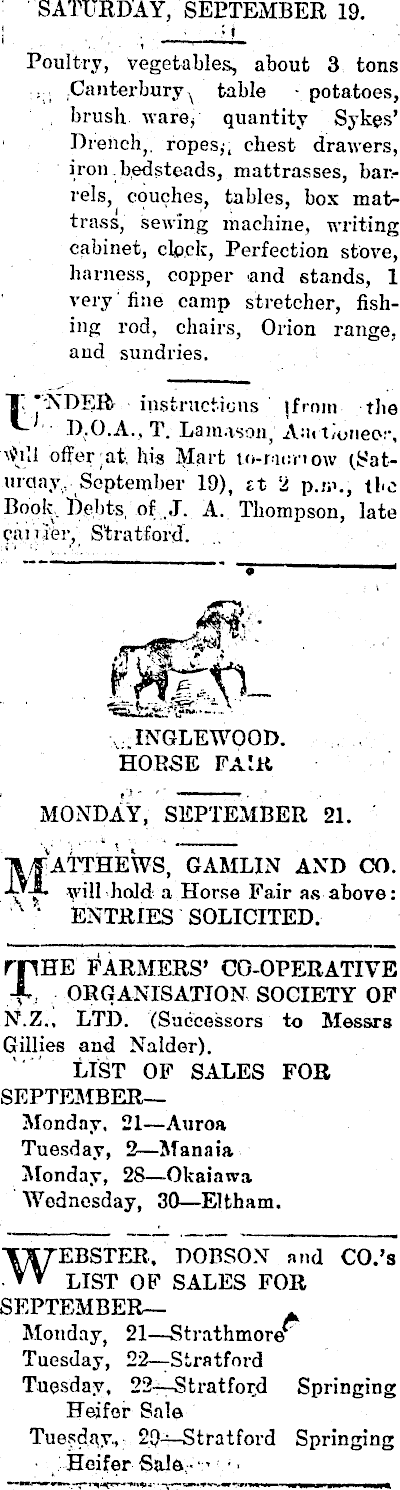 SATURDAY, SEPTEMBER 19. • •»i Poultry, vegetables, about 3 tons Canterbury, table potatoes, brush ware, quantity Sykes’ Drench, ropes,', chest drawers, iron bedsteads, mattrasses, bai> rels, couches, tables, box mattrass, sewing machine, writing cabinet, clock, Perfection stove, harness, copper and stands, 1 very fine camp stretcher, fishing rod, chairs, Orion range, and sundries. T 'NDEB instructions (from the D.O.A., T. Lamason, Auctioneer, avVd offer at, his Mart to-rmnow (Saturday, September 19), zt 2 p.m., the Book Debts of.T. A. Thompson, late can Ter, Stratford. arts grt-v INGLEWOOD. HOUSE FAIR MONDAY, SEPTEMBER 21. ATTHEWS, GAMLIN AND CO. will hold a Horse Fair as above: ENTRIES SOLICITED. mHE FARMERS’ CO-OPERATIVE -f ORGANISATION SOCIETY OF N.Z., LTD. (Successors to Messrs Gillies and Nalder). LIST OF SALES FOB SEPTEMBER— Monday. 21—Auroa Tuesday, 2—Manaia Monday, 28—Okaiawa Wednesday, 30—Eltham. WEBSTER. DOBSON and CO.’s LIST OF SALES FOR SEPTEMBER— Monday, 21—Strathmore” Tuesday, 22—Stratford Tuesday, 22—Stratford Springing Heifer Sale Tuesday, 29—Stratford Springing Heifer Sals