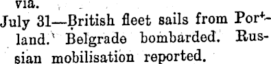 via. July 31—British fleet sails from Portland,' Belgrade bombarded. Russian mobilisation reported.