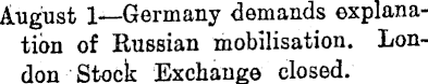 August I—Germany demands explanation of Russian mobilisation. London Stock Exchange closed.