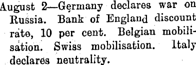 August 2—Germany declares war on Russia. Bank of England discount rate, 10 per cent. Belgian mobilisation. Swiss mobilisation. Italy declares neutrality.