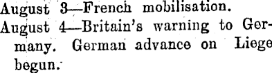 August 3—French mobilisation. August 4—Britain’s warning to Germany, German advance on Liege begun.
