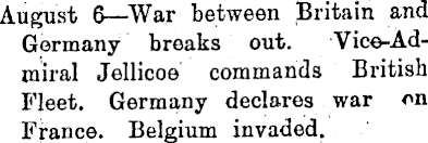 August 6—War between Britain and Germany breaks out. Vice-Ad-miral Jellicoe commands British Fleet. Germany declares war on France. Belgium invaded.