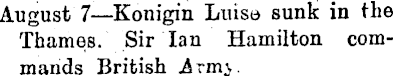 August 7—Konigin Lmse sunk in the Thames. Sir lan Hamilton commands British A :m\