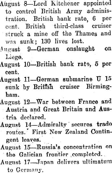August B—Lord Kitchener appointed to control British Army administration. British hank rate, 6 per cent. British third-class cruiser struck a mine off the Thames and was sunk; 130 lives lost. August 9—German onslaught on Liege. August 10—British bank rate, 6 per cent, August 11—German submarine U 15 sunk by BritfsK cruiser Birmingham. August 12—War between France and Austria and Great Britain and Austria declared. August 14—Admiralty secures trade routes. First New Zealand Contingent leaves. Augnst 15—Russia’s concentration on the Galician frontier completed. August 17—. Japan delivers ultimatum to Germany.