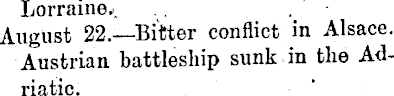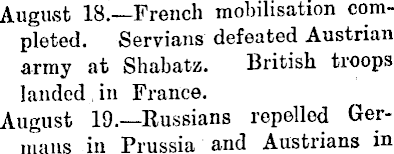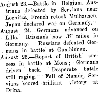August 23.—Battle in Belgium. Austrians defeated by Servians near Loznitza. French retook Mulhausen. Japan declared war on Germany. August 24.—Germans advanced on Lille. Russians now 37 miles in Germany. Russians defeated Germans in battle at Gumbinnen. August 25.—Report of British’ success in battle at Mons; Gormans driven back. Desperate battle still raging. Fall of Namur. Servians scored brilliant victory at Drina.