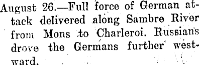 August 26.—Fu1l force of German attack delivered along Sambre River from Mons -to Charleroi. Russians drove the Germans further westward.