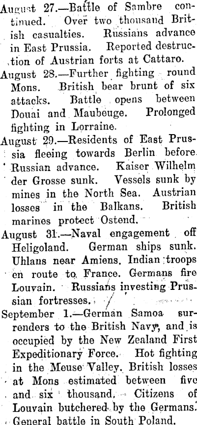 August 27 Battle of Snmbre continued. Over two thousand British casualties. Russians advance in East Prussia. Reported destruction of Austrian forts at Cattaro. August 28.—Further fighting round Mons. British hear brunt of six attacks. Battle opens between Douai and Maubeuge. Prolonged fighting in Lorraine, August 29.—Residents of East Prussia fleeing towards Berlin before. ’ Russian advance. Kaiser Wilhelm der Grosse sunk. Vessels sunk by mines in the North Sea. Austrian losses in the Balkans. British marines protect Ostend. August 31.—Naval engagement off Heligoland. German ships sunk. Uhlans near Amiens. Indian troops en route to, France. Germans fire Louvain. Russians investing Prussian fortresses. September I.—German Samoa surrenders to the British Navy’, and is occupied by the New Zealand First Expeditionary Force. Hot fighting in the Meuse Valley. British losses at Mons estimated between five and six thousand. Citizens of Louvain butchered by the Germans.” General battle in South Poland.