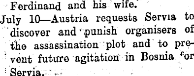 Ferdinand and his wife. July 10—Austria requests Servia to discover and ’ punish organisers of the assassination plot and to prevent future agitation in Bosnia p or Servia.