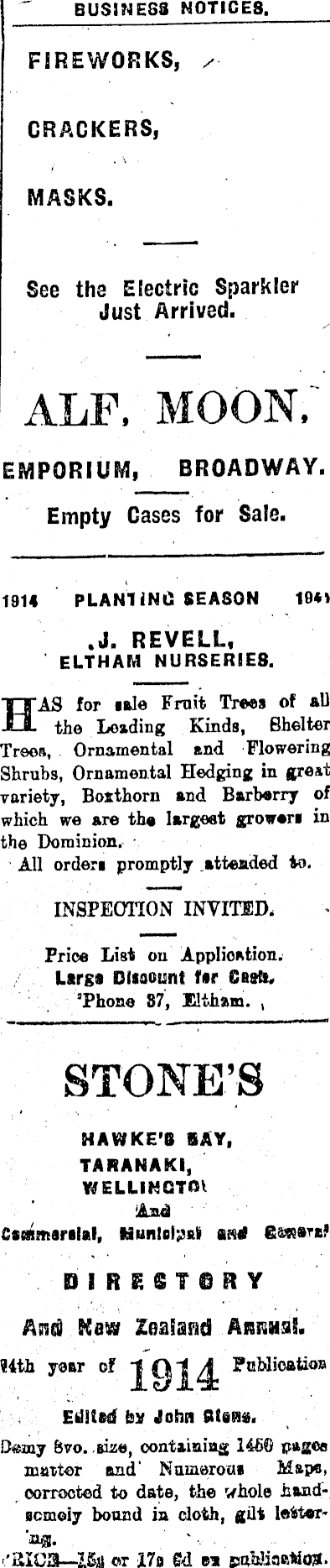 BUSINESS NOTICES. FIREWORKS, CRACKERS, MASKS. See the Electric Sparkler Just Arrived. I, BROADWAY. Empty Gases for Sale. 1914 PLANT iNG SEASON 10«» % J. REVELL, ELTHAM NURSERIEB. HAS for iale Fruit Trees of all the Leading Kinds, Shelter Trees, Ornamental and Flowering Shrubs, Ornamental Hedging in great variety, Boithorn and Barberry of which we are th« largest growers in the Dominion. All orderi promptly attended to. INSPECTION INVITED. Price List on Application. Lsrgs Olioount ffr Castt, 'Phone 87, Eltham. , STONE'S HAWKE'B BAY, TARANAKI, WELLINGTOV £B«ntsrilal, Hunlobml! wti &m»rtf Pnblioatiou Ek\mi to John Btam». D#sny 870. niae, containing 1460 #agee matter and' Naraeroui Mape, corrected to date, the whole handscmoly bound in cloth, gilt lefcternfl. 'RIC*-.l6ti or Z7a 8d e* sjabJiaßAios.