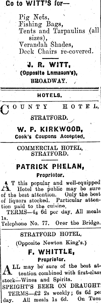 Co to WITT'S for— Pig Wets, Pishing Bags, Tents and Tarpaulins (all sizes), Verandah Shades, Deck Chairs re-covered. a. R. WITT, (Opposite Lamason'f), BBOADWAY. , HOTELS. "BOUNTY H 0 T E L, STRATFORD. W. P. KIRKWOOD, Cook's Coupons Accepted. COMMERCIAL HOTEL, STRATFORD. PATRICK PHELAN, Propriator. AT this popular and well-equipped Hotel the public may be sure of the best attention. Only the best of liquors stocked. Particular attention paid to the cuisine. TERMS— 4g 6d per day. All meals Is. Telephone No. 77. Over the Bridge. STRATFORD HOTEL. (Opposite Newton King's.) F. WHITTLE, Proprietor. ALL may be sure of the best attention combined with first-olass stock—Wines and Spirits. SPEIGHT'S BEER ON DRAUGHT. TERMS—£2 2s woekly; 6s 6d pei day. Ail meals Is 6d. On Tues-