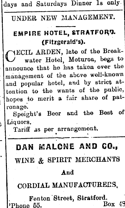 days and Saturdays Dinner Is only UNDER NEW MANAGEMENT, j EMPIRE HOTEL, STRATFOfyO. I (Fitzgerald's). *IECIL ARDEN, late of the BreakJ water Hotel, Moturoa, begs to announce that he has takoa over the management of the above well-known and popular hotel, and by strict attention to the wants of the public, ' hopes to merit a fair share of patronage. Speight's Beer and the Best of Liquors. 1 Tariff *is per arrangement. DAN SALOME AND CO., WINE & SPIRIT MERCHANTS And CORDIAL MANUFACTURERS, Fen ton Street, Stratford. 'Phone 65. 2°x 43