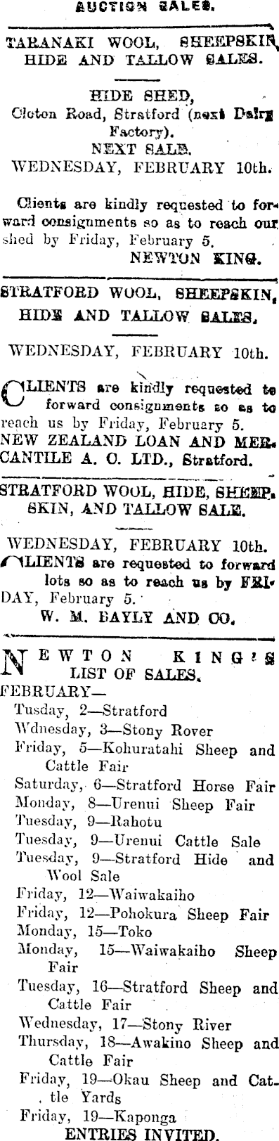 &uctesn a a lg®. TARANAKI WOOL, SHEEPSKIN, HIDE AND TALLOW SALES. HIDE SHED, Oloton Road, Stratford (nest D»!rj Factory). NEXT BALB. WEDNESDAY, FEBRUARY 10th. Clients aro kindly requested to forward consignments so as to reach our shed by Friday, February 5. NEWTON KIN®. STRATFORD WOOL, SHEEPSKIN, HIDE AND TALLOW SALES. WEDNESDAY, FEBRUARY 10th. \ /'"ILIENT3 are kindly requested te forward consignments eo as to reach us by Friday, February 5. NEW ZEALAND LOAN AND MERCANTILE A. 0. LTD., Stratford. STRATFORD WOOL, HIDE,~SHEIP» SKIN, AND TALLOW SALE. WEDNESDAY, FEBRUARY 10th. /~'ILIENTA are requested to forward lota so as to reach ns by F2U« DAY, February 5. W. M. BAYLY AND 00. Newton king ? s LIST OF SALES. FEBRUARY— Tusday, 2—Stratford Wdnesday, 3—Stony Rover Friday, s—Koimratahi Sheep and Cattle Fair Saturday, 6—Stratford Horse Fair Monday, B—Urenui Sheep Fair Tuesday, 9—Rahotu Tuesday, 9—Urenui Cattle Sale Tuesday, 9—Stratford Hide and Wool Sale Friday, 12—Wa iwakaiho Friday, 12—Pohokura Sheep Fair Monday, 15—Toko Monday, 15—Waiwakaiho Sheep Fair Tuesday, 16—Stratford Sheep and Cattle Fair Wednesday, 17—Stony River Thursday, 18—Awakino Sheep and Cattle Fair Friday, 19—=0kau Sheep and Cat. . tie Yards Friday, 19—Kaponga ENTRIES INVITED.