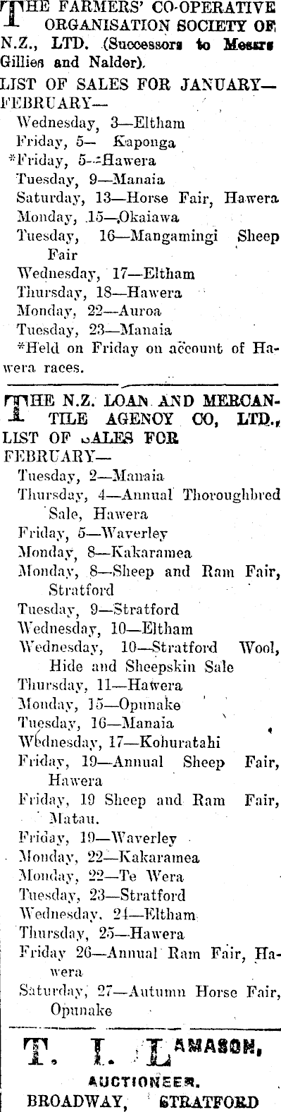 rfIHE FARMERS’ CO-OPERATIVE A ORGANISATION SOCIETY OF N.Z., LTD, (Successors to Messrs Gillien and Nalder), LIST OF SALES FOR JANUARY—FEBRUARY— Wednesday, 3—Eltham Friday, 5 Kaponga "Friday, 5--flawera Tuesday, 9—Manaia Saturday, 13—Horse Fair, Hawera. Monday, 15—.Okaiawa Tuesday, 16—Mangamingi Sheep Fair Wednesday, 17—Eltham Thursday, 18—Hawera Monday, 22—Auroa Tuesday, 23—Manaia "'■Held on Friday on account of Hawera races. mffl N.Z. LOAN AND MERCANA TILE AGENCY CO, LTD., [LIST OF oALES FOR FEBRUARY— Tuesday, 2—Manaia Thursday, 4 —Annual Thoroughbred Sale, Hawera Friday, s—Waver ley Monday, B—Kakara inea Monday, B—Sheep and Ram Fair, Stratford Tuesday, 9—Stratford Wednesday, 10—Eltham Wednesday, 10—Stratford Wool, Hide and Sheepskin Sale Thursday, 11—Hawera M onday, 15—Opunake Tuesday, 16—Manaia Wednesday, 17—Kohuratahi Friday, 19—Annual Sheep Fair, Hawera Friday, 19 Sheep and Rain Fair, Matau. Friday, 19—Waverley Monday, 22—Kakararnea Monday, 22—Te A Vera. Tuesday, 23—Stratford Wed ne sd ay. 2 4—El th a m Thursday, 25—Hawera Friday 26—Annual Ram Fair, HaSaturday, 27—Autumn Horse Fair, Opunake AUCTIONEER. BROADWAY, STRATFORD