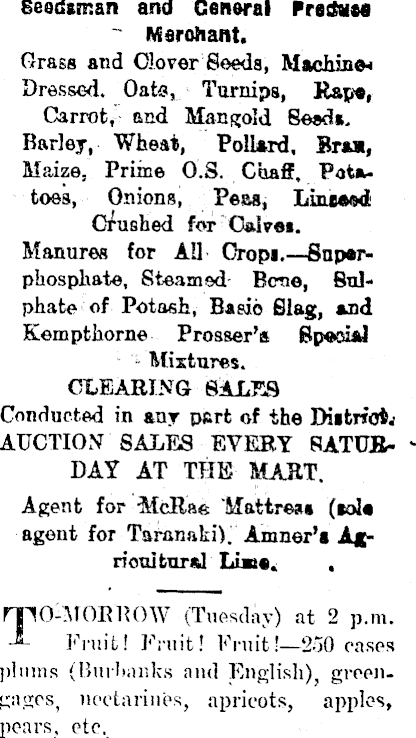 Beadsman and General Pre&ise Merchant. Grass and Clover Seeds, Machine* Dressed. Oats, Turnips, Rapa, Carrot, and Mangold Bead*. Parley, Wheat, Pollard, Bras, Maize. Prime O.S. Chaff. Potatoes, Onions, Peas, Luaeitod Crashed for Calves. Manures for All Crop*.—Snparphosphate, Steamed Bene, Sulphate of Potash, Basic Blag, and Keinpfchorne Prosser J a Special Mixtures. CLEARING SALES Conducted in any part of the District.' AUCTION SALES EVERY BATUJB- - DAY AT THE MART. Agent for Mcßae ‘Mattress (sole agent for Taranaki). Amner’s Agricultural Lisi*. mO-MORROW (Tuesday) at 2 p.m. Emit! Emit! Emit!—2so cases plums (Bnihanks and English), greengages, nectarines, apricots, apples, pears, etc.