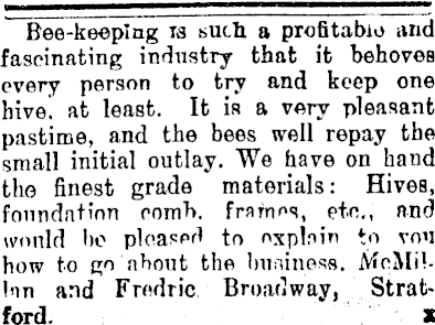Bee-keeping ts such a profitable and fascinating industry that ifc behoves every person to try and keep one hive! at least. Ifc fa a very pleasant pastime, and the bees well repay the small initial outlay. We have on hand tho finest grade materials: Hives, foundation comb, frames, etc., and would be ploaped to nxplnin to ron how to go about the burliness. McMillan and Fredric Broadway, Stratford. I