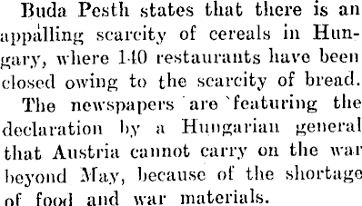 Buda Pesth states that there is an appalling scarcity of cereals in Hungary, where 140 restaurants have been closed owing to the scarcity of bread. The newspapers are featuring the declaration by a Hungarian general that Austria cannot carry on the war beyond May, because of the shortage of food and war materials.