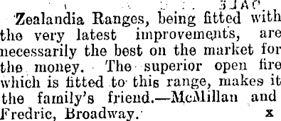 • t 3JA c\ Zealandia Ranges, being fitted with the very latest improvements, are necessarily the best on the market for the money. The superior open fire which is fitted to this range, makes it the family’s friend.—McMillan and Fredric, Broadway. x