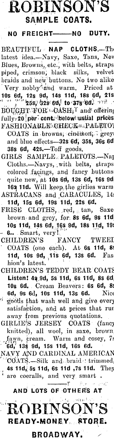 ROBINSON’S SAMPLE COATS. NO FREIGHT NO DUTY. BEAUTIFUL NAP CLOTHS.—The latest idea.—Navy, Saxe, Tans, New Blues, Browns,, etc., with belts, straps, piped, crimson, black silks, velvet, braids and neiv buttons. No two alike. Very nobby' and warm. Priced at 10s 6d, 12s 9d, US lid, 18s 6d, 21s, 11 to 374' ted) •'•fi' - BOUGIUT FOll 1 and- offering fully 20; per' cent, ibelowt uslial prices. FASHIONABLEbGHECffin.PALp’QI COATS in browns, cine mod, greys and blue effects— 32s 6d, 355, 36s 6d, 38s 6d, 42S. — Toff goods. GIRLS SAMPLE PALETOTS—Nap Cloths.-—Navys, with belts, straps, colored facings, and fancy buttons, quite new, at 10s 6d, 13S 6d, 16S 9d, lid. Will keep,.{die girlies warm. ASTRACANS and CARACULES, 14s lid, 15s 6d, 19s lid, 22s 6d. FRISE CLOTHS, red, tan, Saxe, brown and grey, for 8s 6d, 9S lid, 10s lid, Us 6d, - 6.. Smart, very! CHILDREN’S FANCY TWEED COATS (one each). At 6s lid, 8s lid, 10s 9d, 11s 6d, 13S 6d. Fashion’s latest. CHILDREN’S TEDDY BEAR COATS Listen! 4q 9d, 5s lid, 6s lid, 8s 6d, 10s 6d. Cream Beavers: 6s 6d, 8s 6d, 9s 6d, 10s lid, 13s 6d. Nice goods that wash well and give every satisfaction, and at prices that run away from previous quotations. GIRLIE’S JERSEY COATS (fancy knitted), all wool, in saxe, brown, fawn, cream. Warm and cosey, 7s 6d, : 134 9d, 15s lid, 16s 6d. NAVY AjND CARDINAL AMERICAN COATS.—SiIk and braid : trimmed, 4s lid, 5s lid, 6s lid ,7s lid. They 1 are coeralls, and very smart . AND LOTS OF OTHERS AT ROBINSON’S READY-MONEY »TORE. BROADWAY.