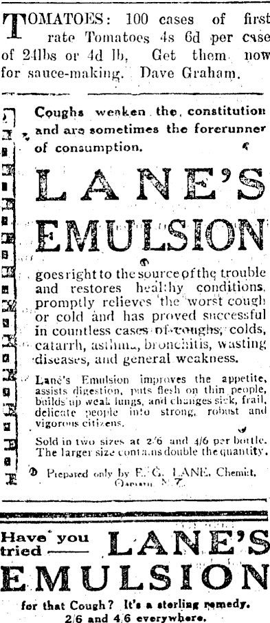 TOMATOES: 100 coses of first rate Tomatoes 4s Gd per esse of 24Ibs or 4d lb. Got them now for sauce-making. Dave Graham. Coughs weaken the. constitution and aro sometimes the forerunner of consumption. *T goes right to the source pf the trouble and restores healthy conditions, promptly relieves tire worst cough or cold and has proved successful in countless cases of-roughs; colds, catarrh, asilim~, bronchitis, wasting diseases, and general weakness. Line's Emulsion improves the appetite, assists digestion. puts fit-sh on thin people, builds'up .vcaU lungs, and changes sick, frail, delicate people into strong, robust ami ■ 1 Cl t! Sold in two sires at z'6 and 4/6 per bottle. The larger size cunt.a.ns double the quantity • h Picparexl onlv by F..’Cj. 1 ,ANlc. Cbenriit. ■O S T ■■■—~i.i—ianroa S- LANE’S EMULSION for that Cough ? It’a a starling remedy. 2/6 and 4,6 everywhara.